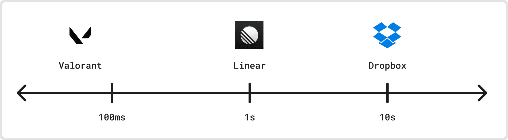 They may not feel like sync apps, but multiplayer games like Valorant often have highly sophisticated netcode pushing updates through centralized infrastructure to keep game state in sync across players around the world. Valorant is a fast-paced competitive 5 vs. 5 multiplayer game, and it targets 60Hz for its client updates. So, its sync protocol needs to support 60 updates per second per client continuously flowing through the system during an active game.