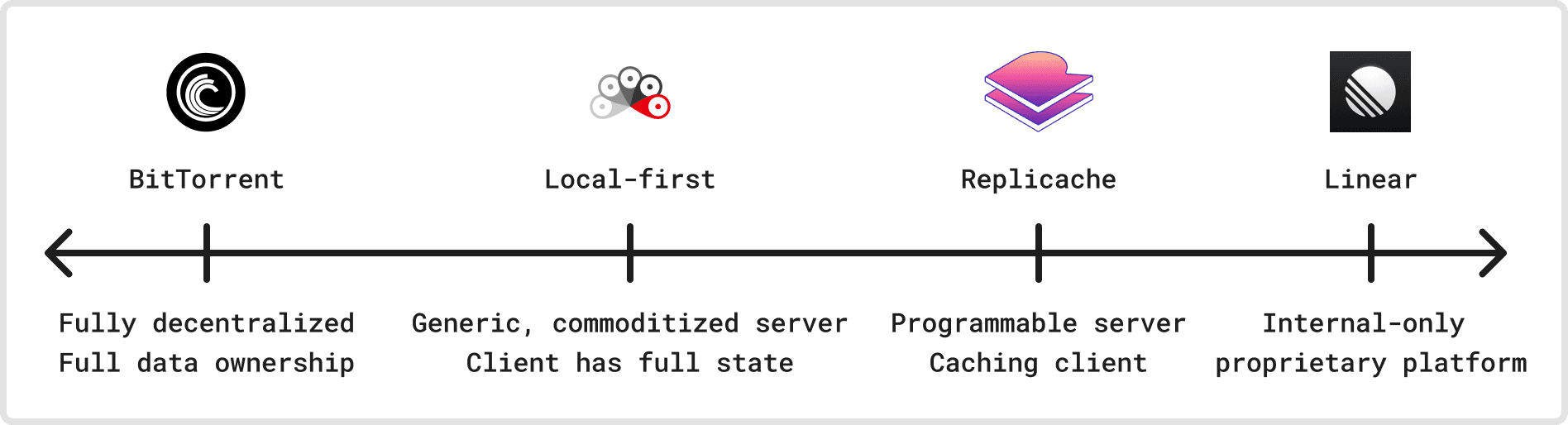 On the other side, apps like Figma, Asana, and Linear have proprietary sync engines that are only available to their internal product teams. All three rely on centralized infrastructure also operated by the same organization.