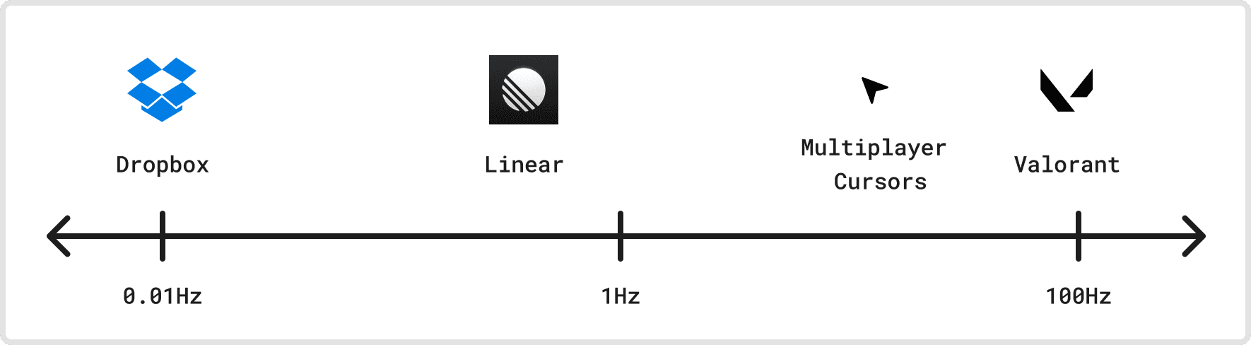 Users don’t rearrange issues or create new projects on Linear that often, and most objects in their system are mostly idle. We don’t know their update rate per client publicly, but it’s likely never much more than 1Hz and much lower than that averaged over time.