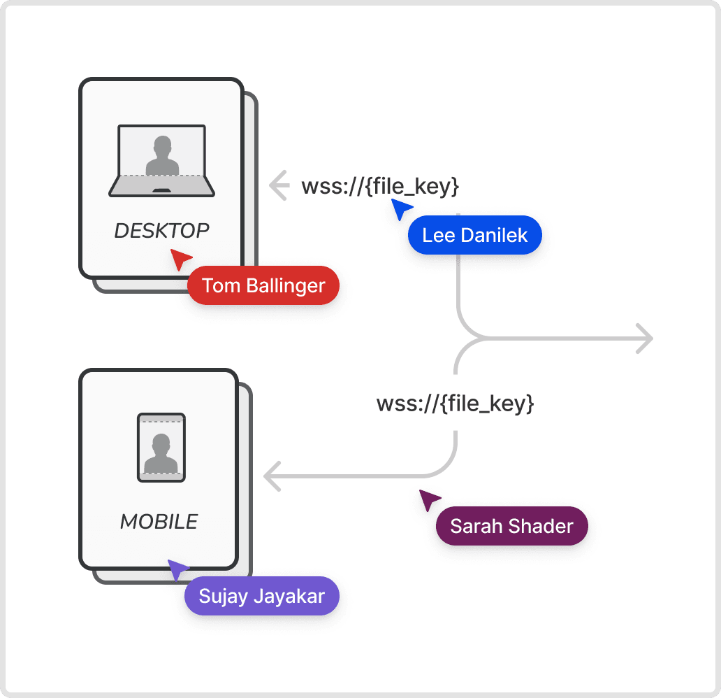 If we look at just the cursors in Figma’s multiplayer view, the cursor state is tiny: just a few bytes per active user. This state is cheap to store everywhere and broadcast whenever it changes. Figma tracks a lot more state than just the cursors, but this perspective would apply to an app that uses, say, Liveblocks for only syncing cursor state.