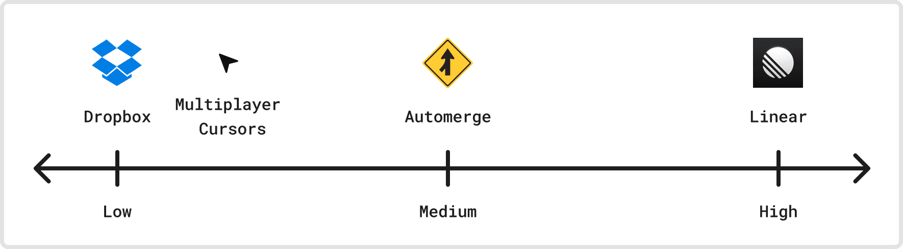 On one extreme, we have systems like Dropbox that don’t understand anything about the files. To the sync engine, file contents are just uninterpreted streams of bytes and completely unstructured. Systems with smaller data can also have low structure. For example, the state for Figma’s multiplayer cursors has a very simple state description: just a map of a User ID to a cursor position within the document. There’s more structure here than Dropbox’s opaque files, but it isn’t much.
