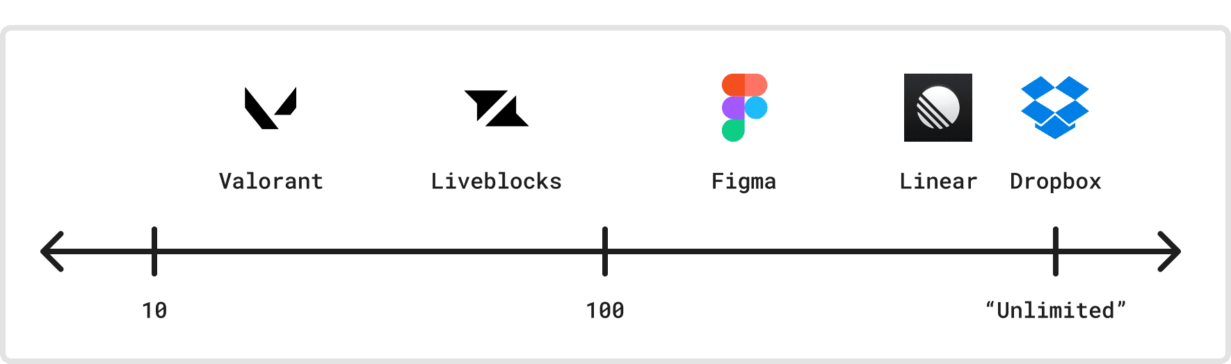 As with offline support, Valorant has a built-in limit in its product for this dimension: There are at most 22 participants per game (10 players plus coaches and observers). Figma has a higher but still static limit for its files: 200 editors, 200 cursors, and up to 500 total participants. Liveblocks permits at most 50 simultaneous connections per room on their Pro plan.