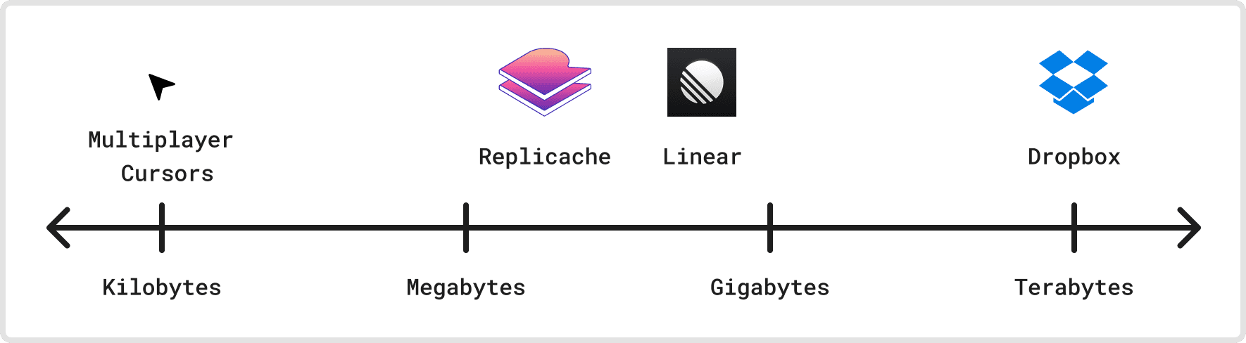 Linear, on the other hand, can have hundreds of megabytes of issue data (the internal Linear project is 150MB as of last year), and it’s stored in IndexedDB on Web clients, and parts of it are lazily fetched as needed. Replicache, as a similar point on this dimension, recommends keeping total data size under 64 MB.