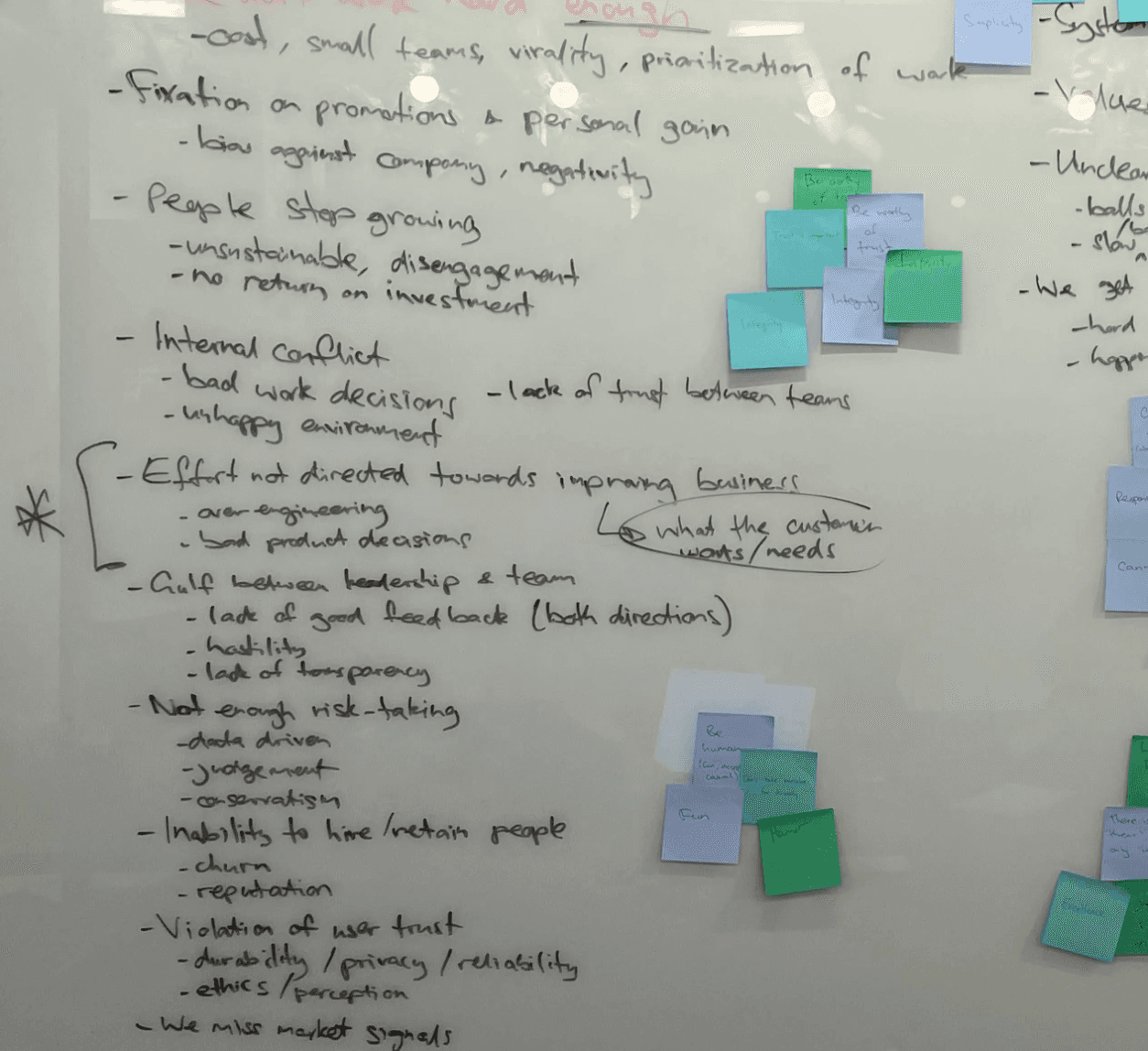 We wrote down a set of cultural risks that could lead to the business failing. This part was easier because we’re engineers and engineers are good at being negative.