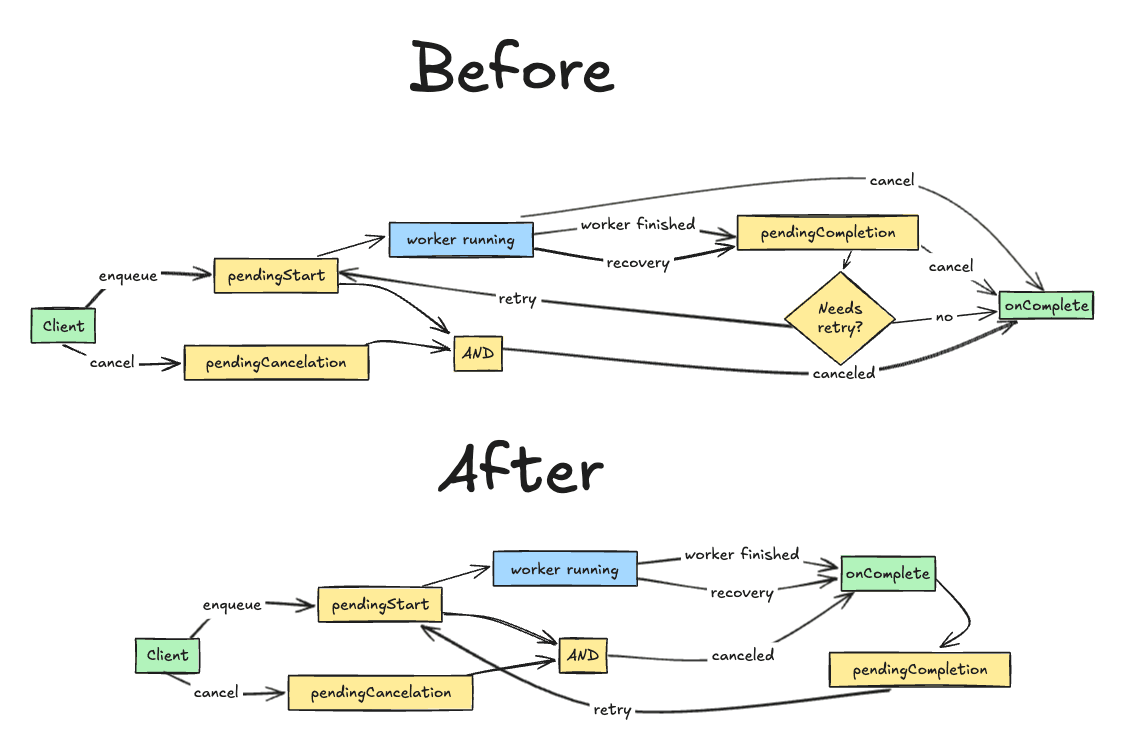 I decided to make a concerted effort on state machine modeling recently, in order to build my Workpool component where correctness is critical. Here’s the state machine for a job in the pile of work to complete. After a lot of iteration, I landed with the “Before” state. But it still seemed messy.