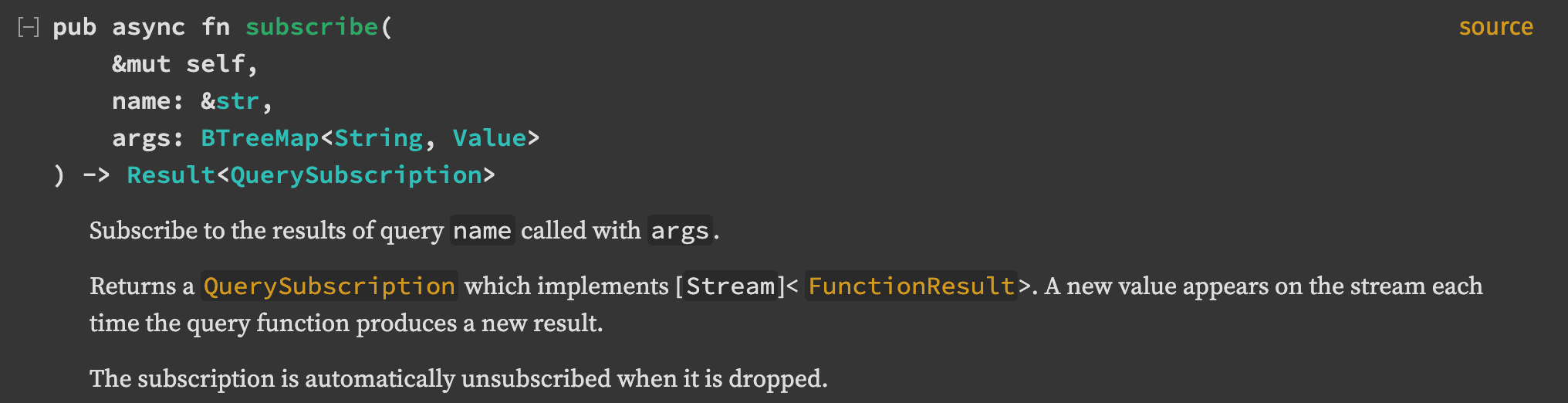Subscriptions are exposed as a futures::Stream, yielding new values whenever Convex pushes them over the wire when dependent backend data changes.