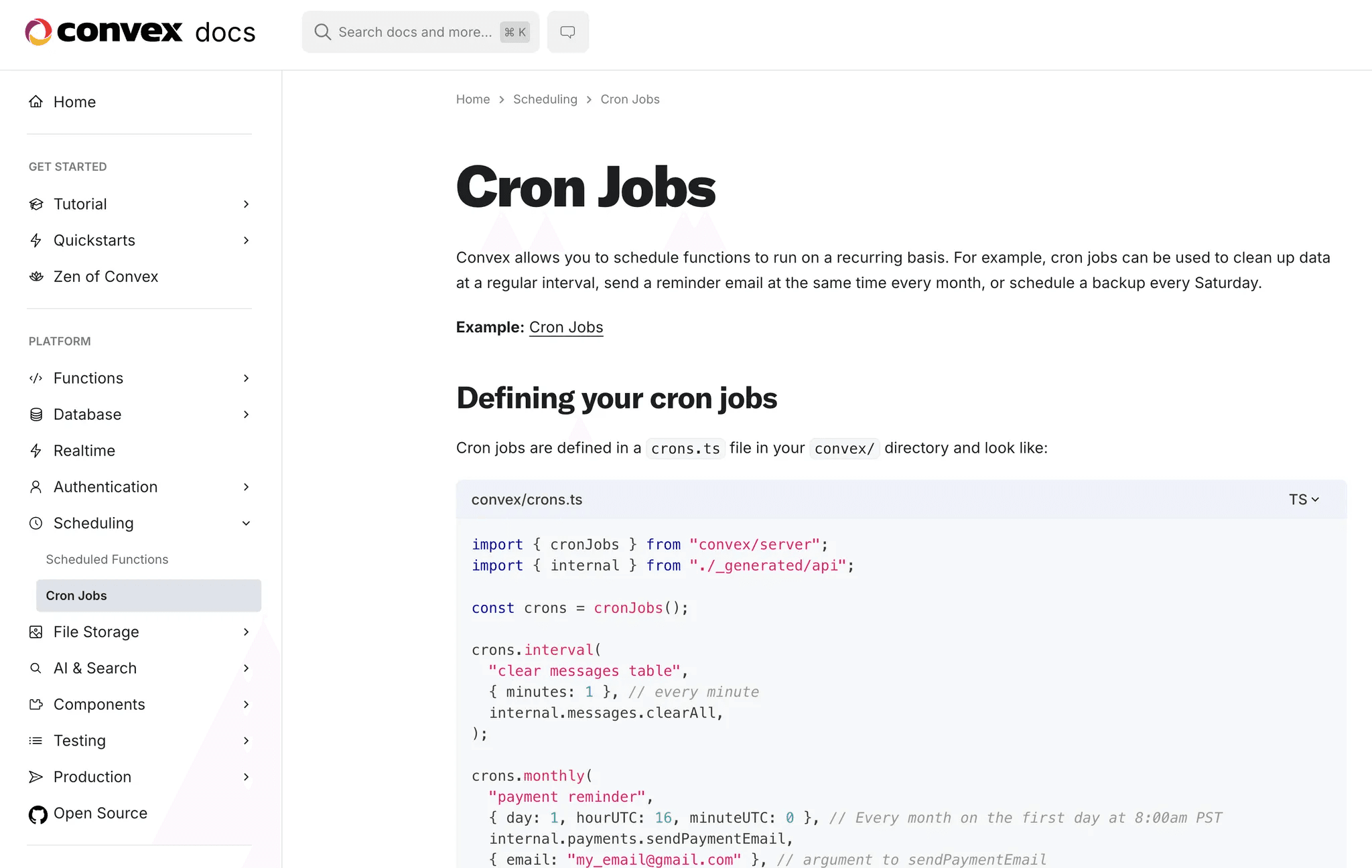 {minutes: 1}tells Convex to run this job every minute. You can adjust this interval based on your needs. - Function Reference: