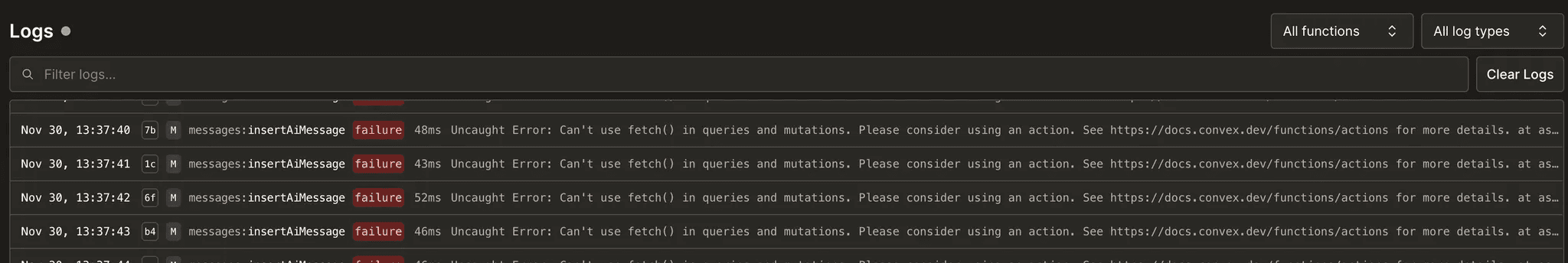 The logs revealed that the fetch function cannot be used directly within queries or mutations. Instead, Convex recommends implementing an Action for such cases, which we'll cover in the next section.