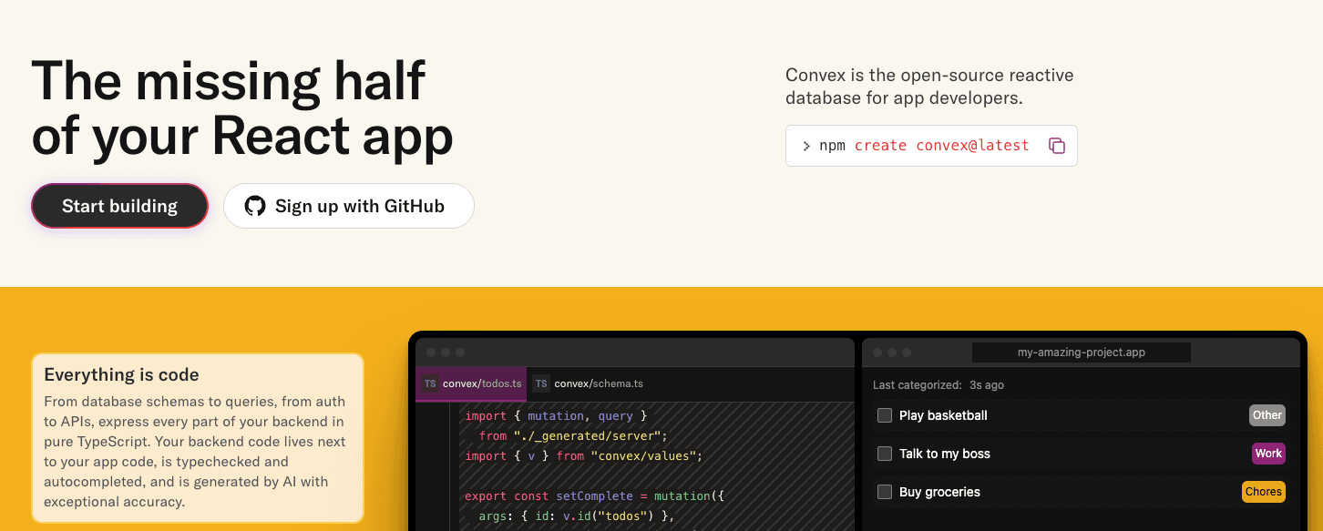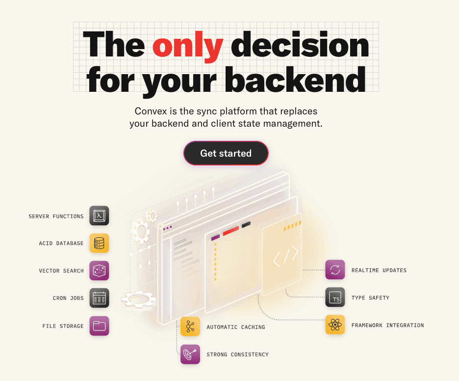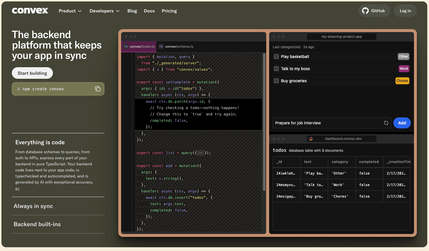 Convex is the backend platform with everything you need to build your full-stack AI project. Cloud functions, a database, file storage, scheduling, workflow, vector search, and realtime updates fit together seamlessly.