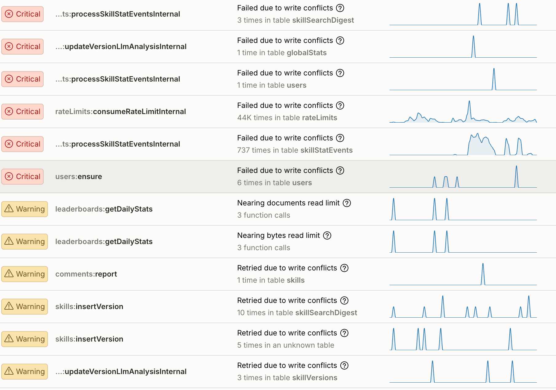 The good news is that Convex is designed to serve large amounts of users even on AI-written code. Of course Convex will do exactly what your code tells it to; if your code is inefficient, you’ll discover issues as you scale. Luckily, Convex primitives provide the tools to make your system scale. This guide describes how to tackle finding the hot spots in an application running at scale in Convex, use insights from the Convex cli to find and help you (or your agent) optimize every step of your app. Potentially by orders of magnitude.