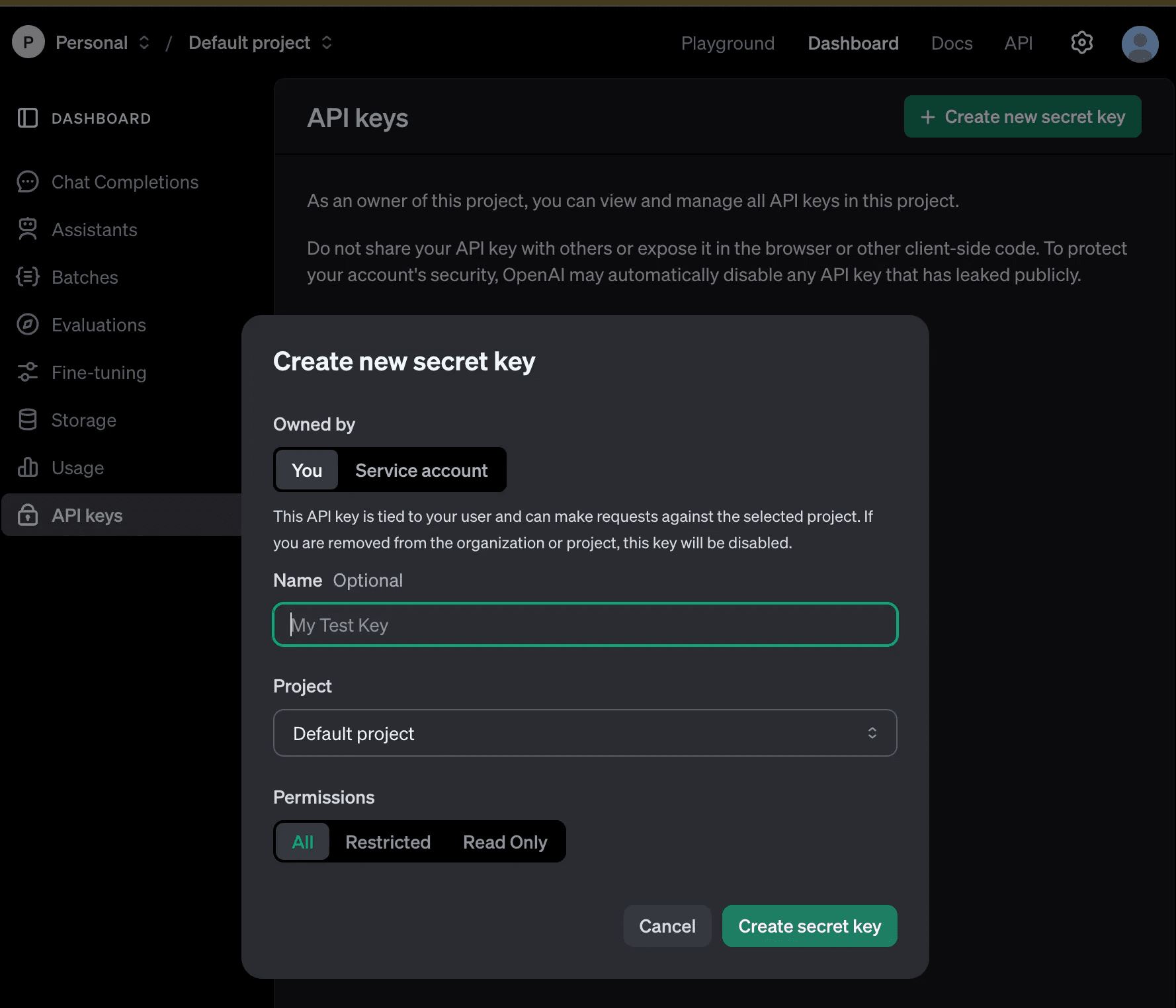 your_openai_key_herewith your actual API key. Ensure you securely store this key, as it will only be displayed once during creation.⚠️ Note: