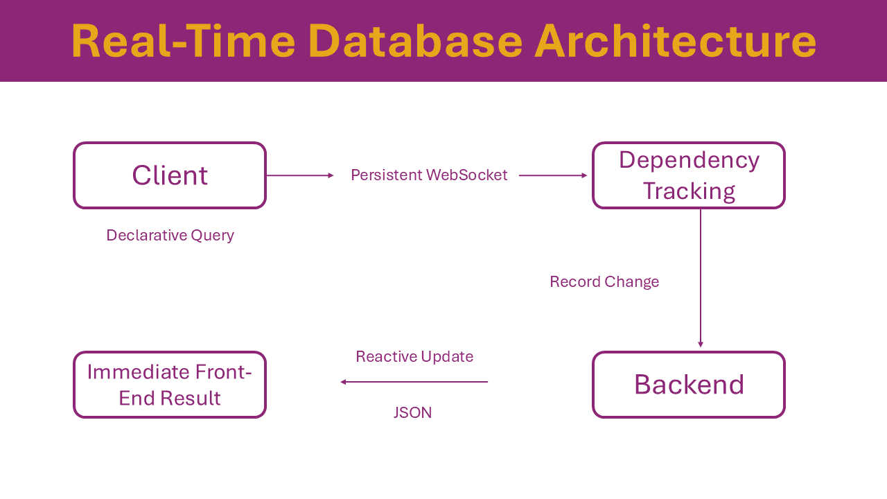 Real-time databases flip the script. Clients subscribe to specific data, and updates are pushed immediately to every subscribed user. The frontend reacts in real-time, and users see the latest state instantly.
