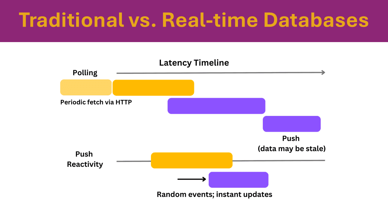 Traditional databases use a request/response model. The client asks for fresh data, and the server responds. To stay current, apps often rely on polling to check for backend updates every few seconds. But this approach can burn resources, add latency, and still leave users with outdated data.