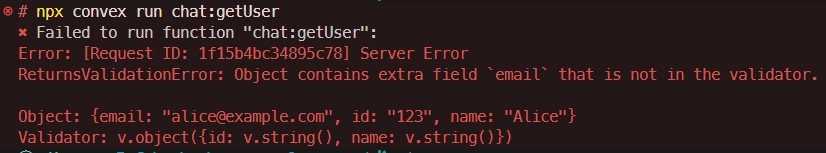 18With a return validator, Convex enforces exactness at runtime. If you return extra fields, you get a runtime error instead of accidentally leaking data. (Ask me how I know.)