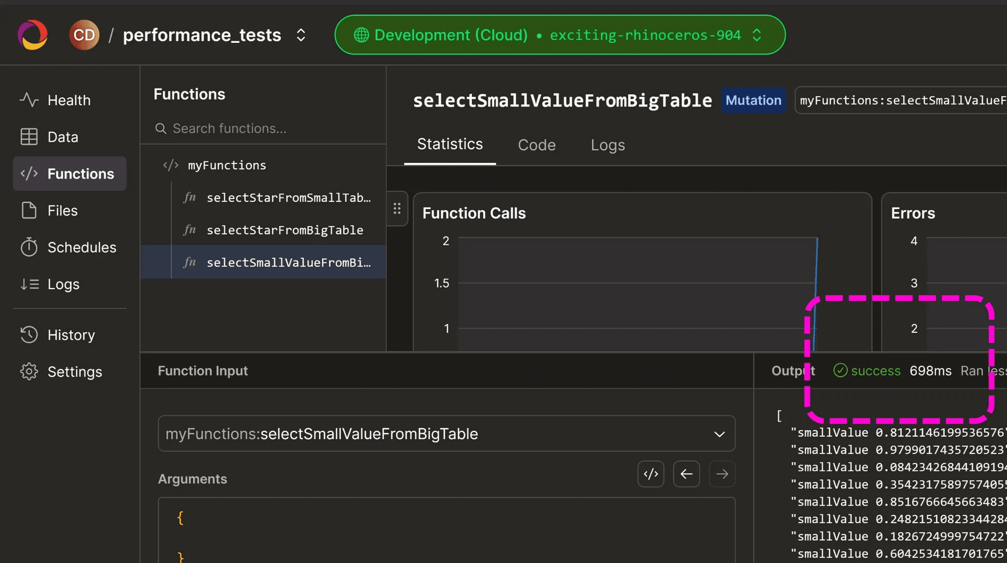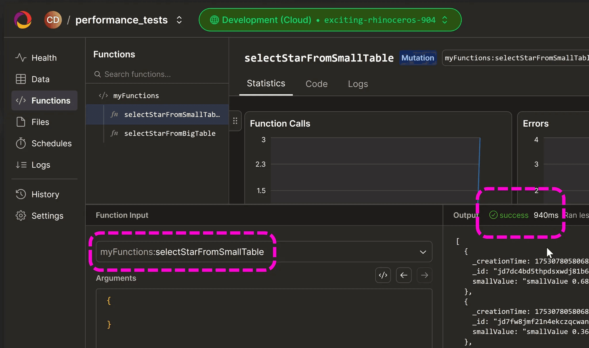 8If we go to the functions tab in the Convex Dashboard we can run the function which turns out to be about 900ms.