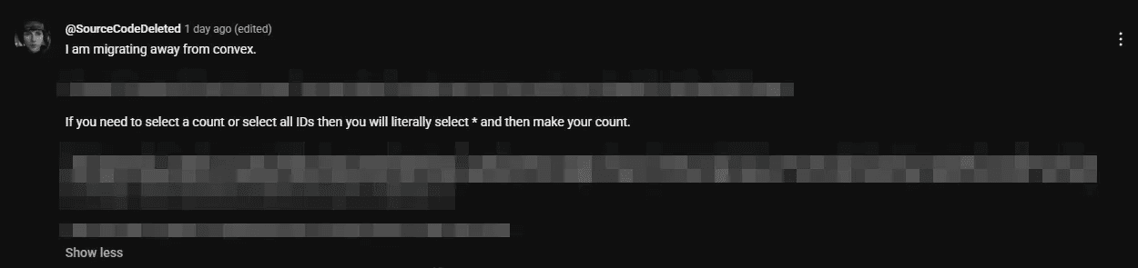 So the only way to count our rows from a query is as the author suggests, to return back all the rows you want then count them. So again, why cant Convex support COUNT? Postgres, MongoFB and Firebase have count primitives.
