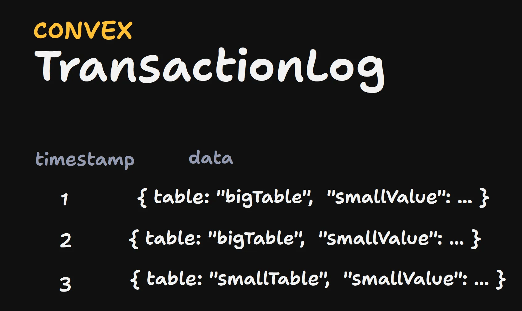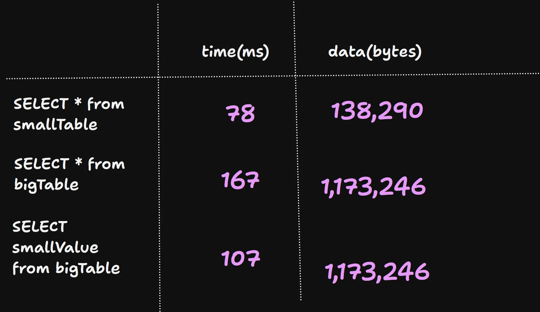 So that means that when you want to read a number of rows that includes the bigValue it has to do a lookup into this other area first to grab the entire row. So the optimization that it performs with SELECT “smallValue” is to allow it to skip this expensive lookup and retrieval. This is something Convex doesn't do because its actually storing documents to its underlying storage and not columns.