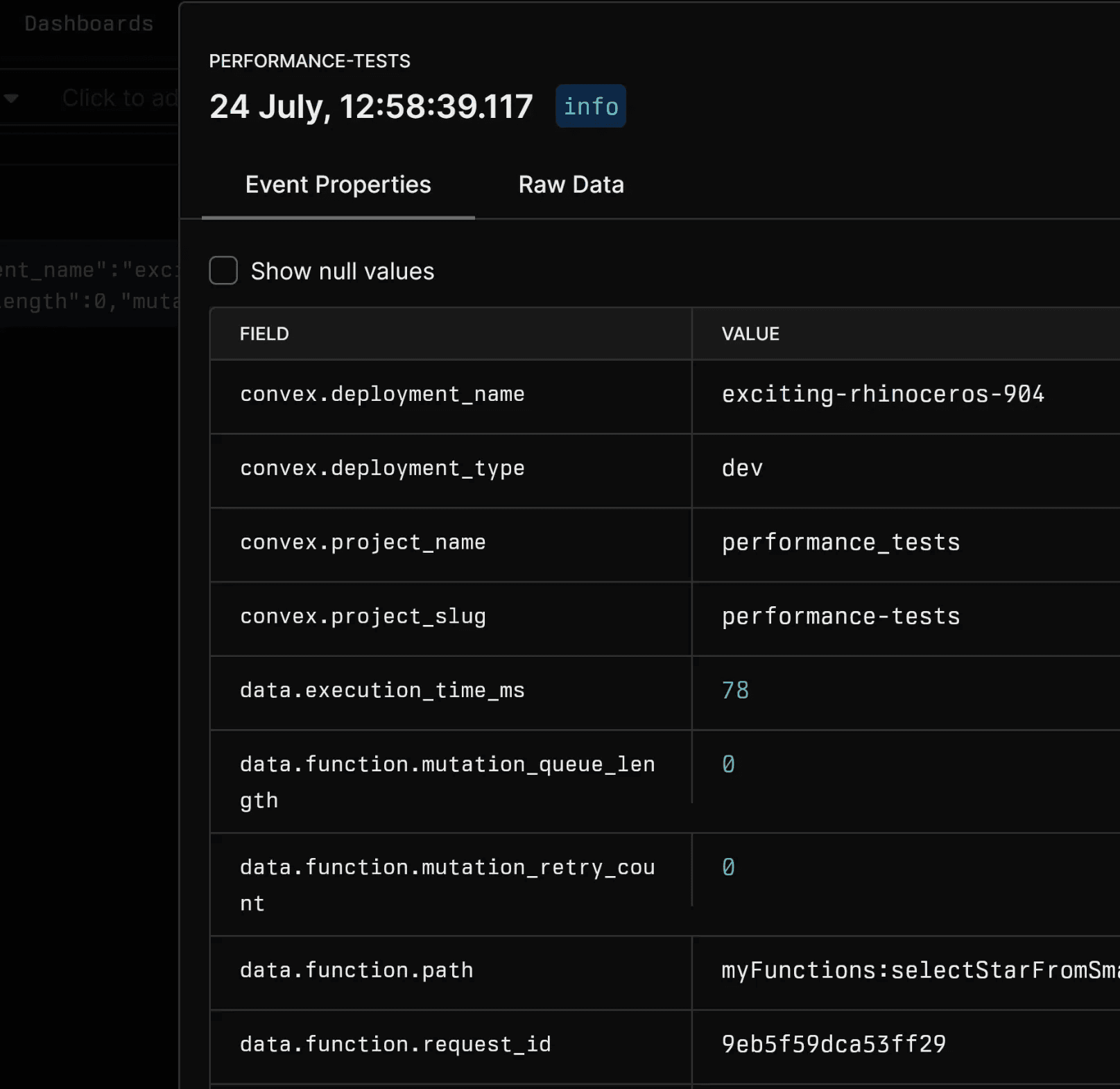 Well unfortunately the Convex dashboard doesn't expose this information to us, but all is not lost as we can go into this integrations tab an enable one of these Log Stream providers to get more detailed info about each call.