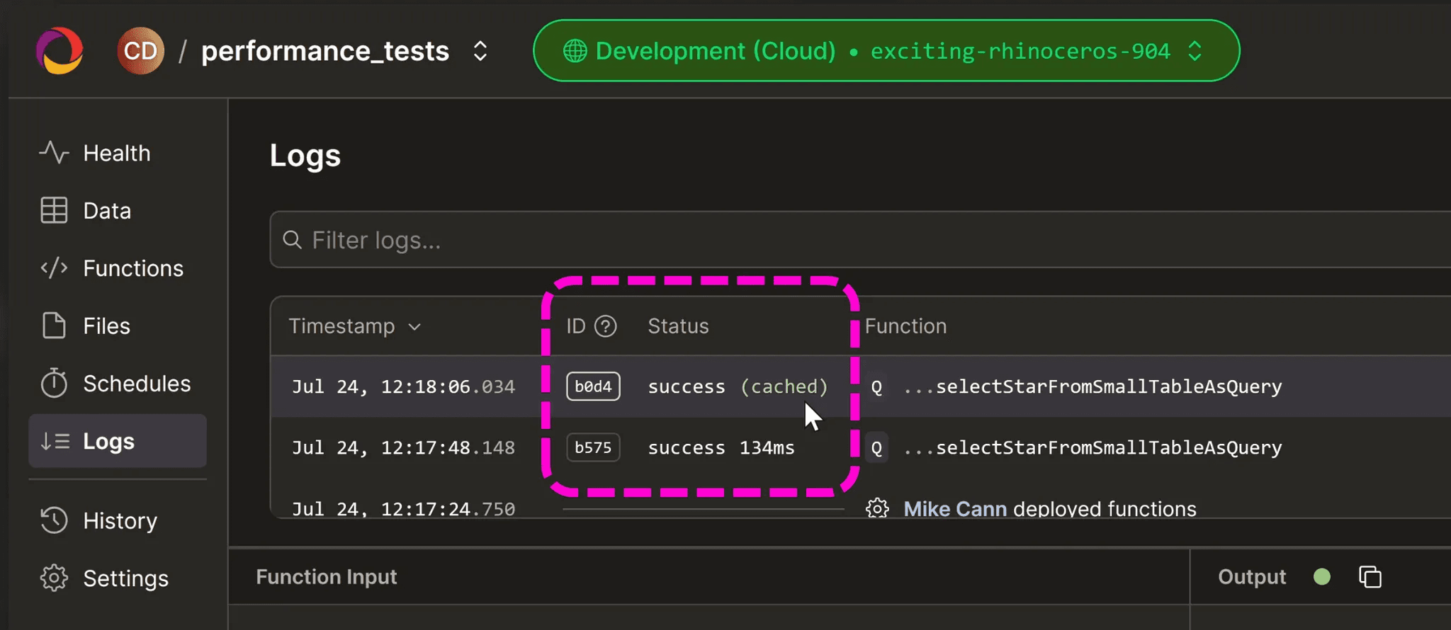 Once I have Axiom hooked up to our Convex backend I can try our selectStartFromSmallTable function again and hop back to Axiom and checkout the log line.