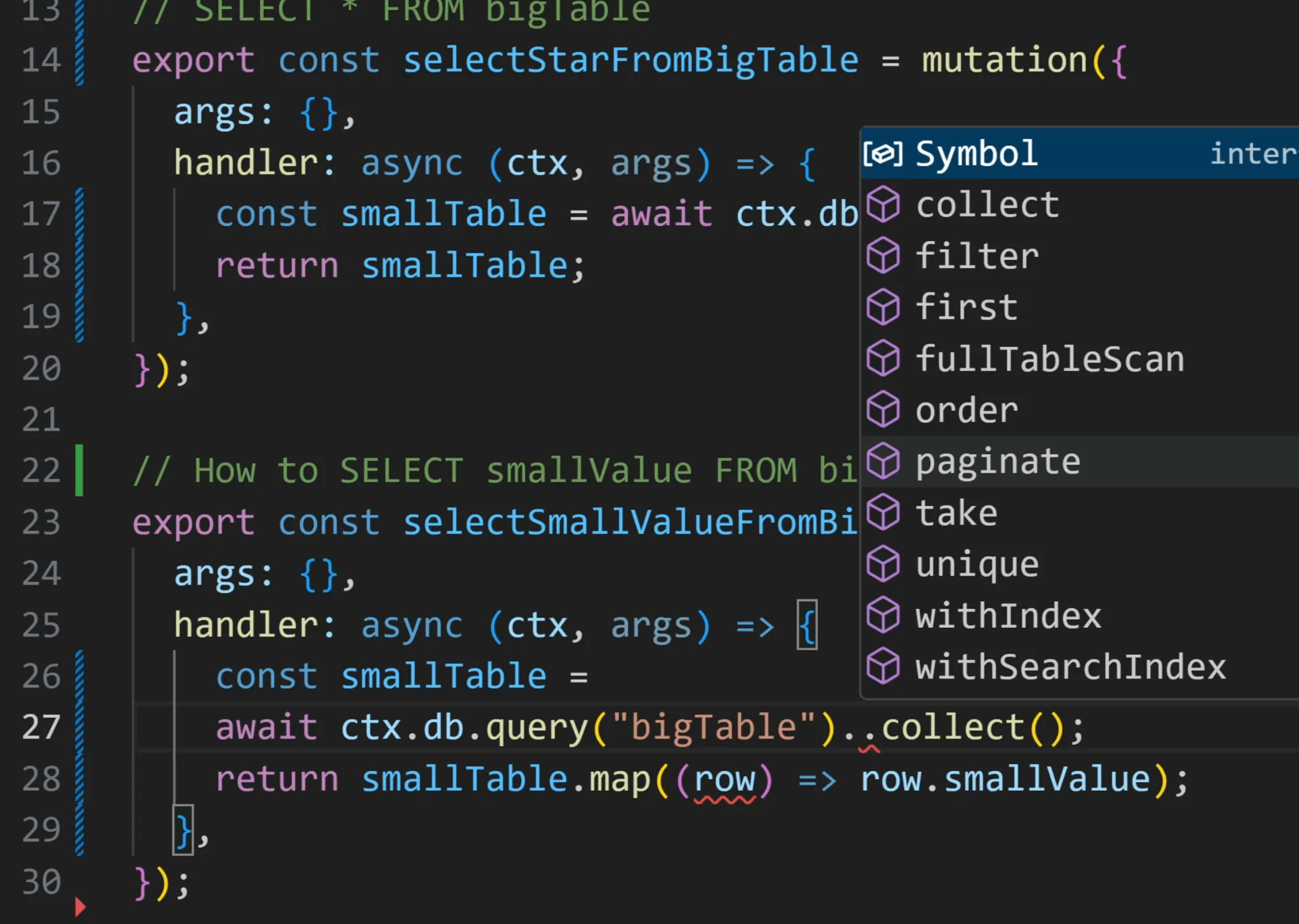 Now lets say we want to query that does the SQL equivalent of SELECT * from smallTable this is how you might do it in Convex: