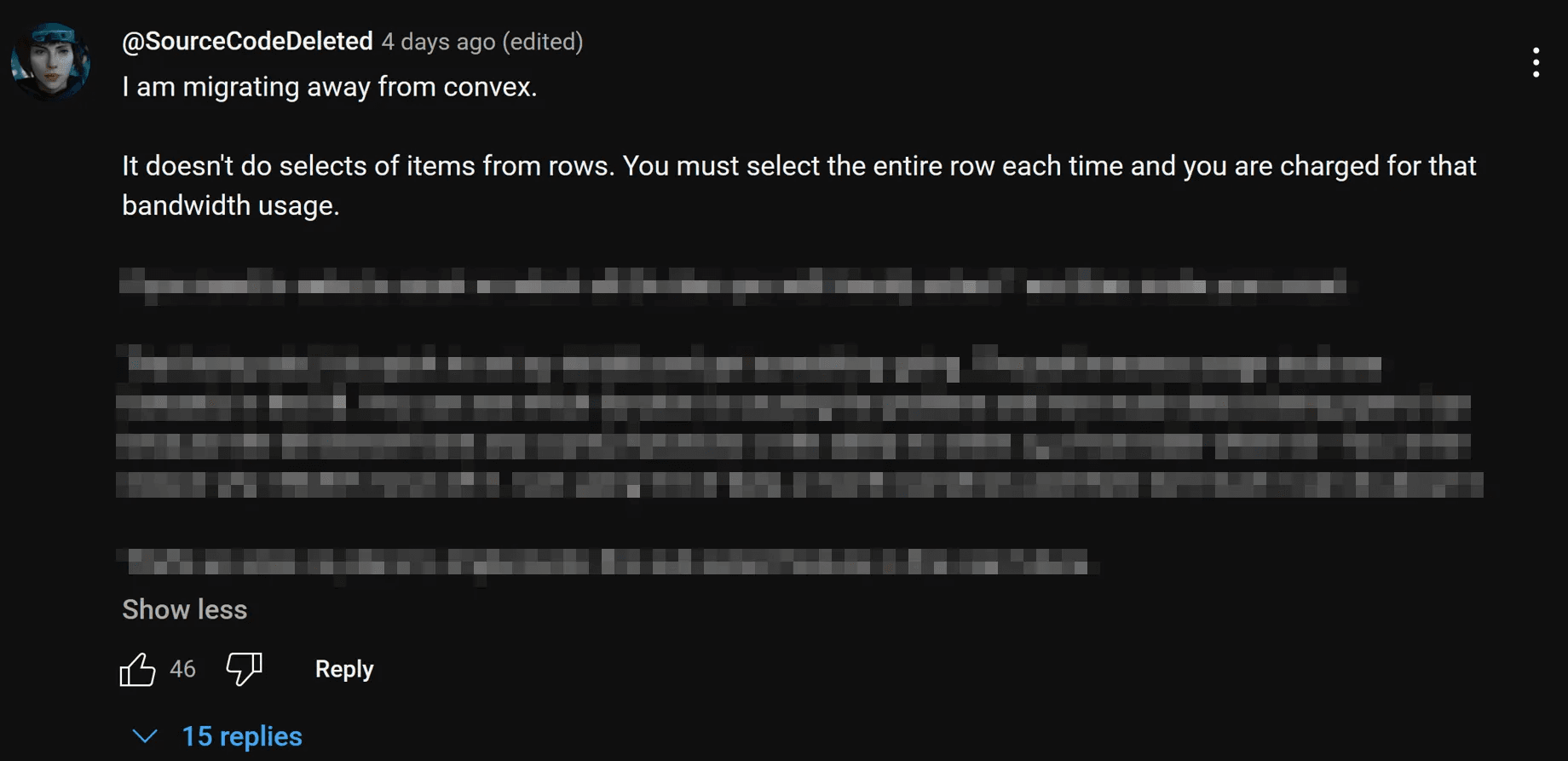 SELECT would only be cheap if Convex could skip reading the big fields in storage. But Convex stores whole JSON docs, not column chunks so it still has to read the full blob, then throw away what you didn’t ask for.